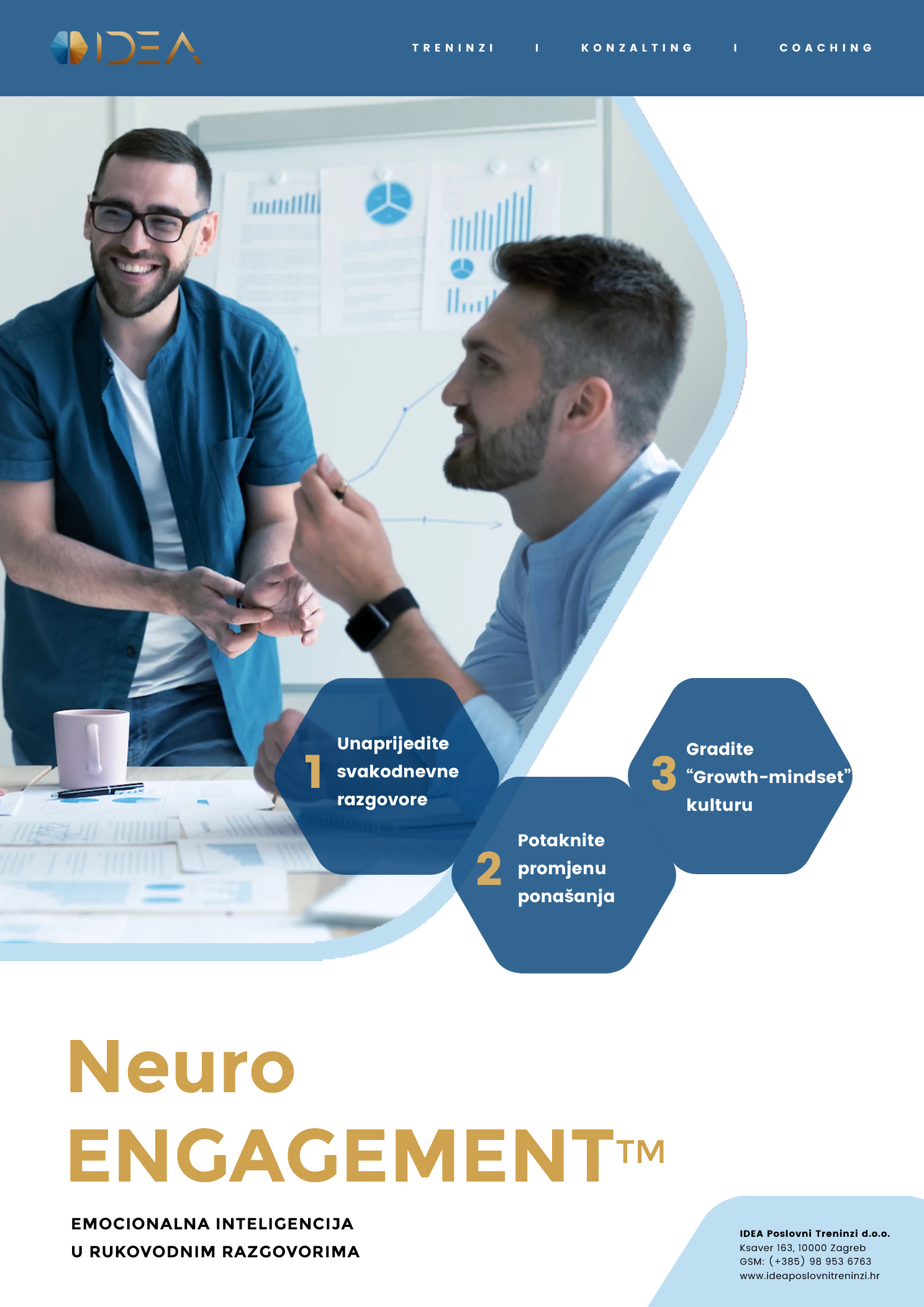 IDEA NeuroENGAGEMENT™ je praktična edukacija osmišljena kako bi rukovoditelji poboljšali angažman zaposlenika i na poticajan i motivirajući način vodili najvažnije svakodnevne razgovore sa zaposlenicima.